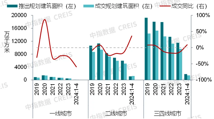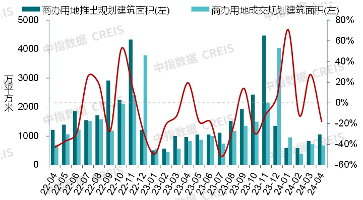图:2019年-2024年4月各线都会商办用地成交计划制造面积及同比变动趋向