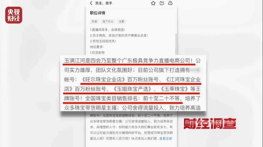 记者应聘进入广东省四会市玉满江河珠宝店。这家珠宝店具有众个王牌直播账号,珠宝出售世界排名前十至二十。