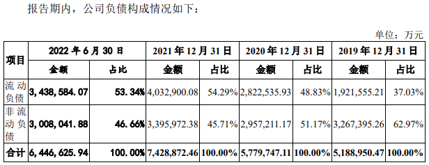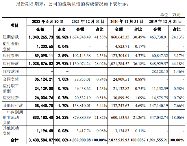 惠科股份的活动欠债要紧由短期借债、应付单子、应付账款组成,合计占活动欠债比例别离为71.48%、70.69%、72.08%和71.49%。