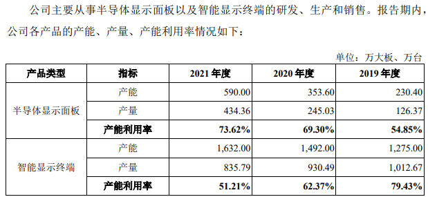 招股书显示,2021年惠科股份半导体显示面板产能愚弄率为73.62%。而因为2021年面板行业炎热,各大企业均处于满产满销状况。