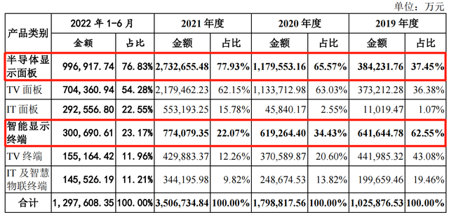 分产物来看,惠科股份要紧产物包含半导体显示面板和智能显示终端两大类。2019年,惠科股份以智能显示终端产物为要紧收入起源,彼时该产物收入占比为62.55%,同期另一要紧产物半导体显示面板收入占比为37.45%。跟着公司向半导体显示企业转型,2022年上半年,半导体显示面板收入占比上升至76.83%。