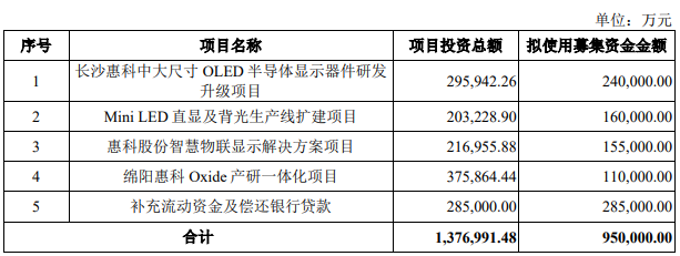 惠科股份本次拟公然荒行股票数目不低于本次发行并上市后总股本的10%(含10%),即不低于64,444.4444万股(含本数),拟召募资金950,000.00万元,别离用于长沙惠科中大尺寸OLED半导体显示器件研发升级项目、MiniLED直显及背驾临蓐线扩修项目、惠科股份聪明物联显示办理计划项目、绵阳惠科Oxide产研一体化项目、添加活动资金及归还银行贷款。