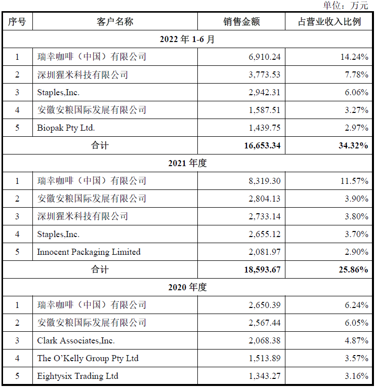 陈诉期各期,公司向前五大客户出卖收入占当期生意收入比重区别为26.02%、23.9%、25.86%和34.32%。瑞幸咖啡正在2020年进入公司客户名单,并正在以来平昔为公司第一大客户,公司各期向瑞幸咖啡出卖占比区别为6.24%、11.57%和14.24%。
