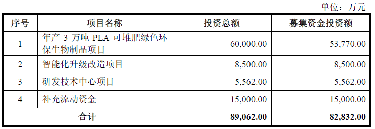 此次IPO上市,恒鑫存在对准的也是邦内方才起步的PLA可生物降解产物市集,公司拟召募资金8.28亿元,此中5.38亿元参加“年产3万吨PLA可堆肥绿色环保生物成品项目”,占总募资比重跨越64.91%。
