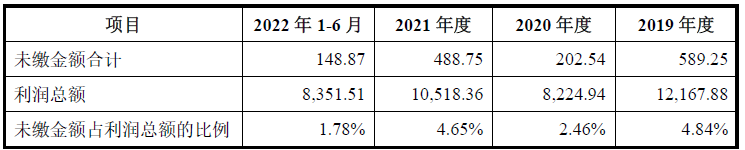 陈诉期内,恒鑫存在未缴社会保障、住房公积金合计区别为589.25万元、202.54万元、488.75万元和148.87万元,占剔除股份付出用度及对参股公司投资失掉后的利润总额的比例区别为4.84%、2.46%、4.65%和1.78%。