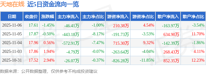 11月6日的资金流向数据方面,主力资金净流出46.41万元,占总成交额1.0%,逛资资金净流入210.38万元,占总成交额4.54%,散户资金净流出163.97万元,占总成交额3.54%。