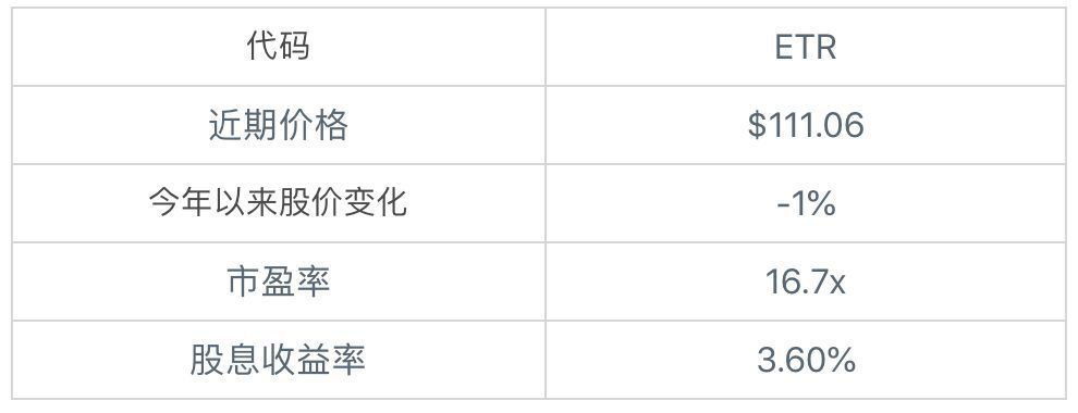 对付对安适性感乐趣的投资者来说,Entergy(ETR)是最具防御性的,约85%的发售额来自阿肯色州、途易斯安那州、密西西比州和得克萨斯州受拘押的公用事迹运营。华尔街估计,异日几年Entergy公司利润的均匀年增进率约为7%,高于此前的6%。正在资历了2020年和2021年的飓风和风暴之后,Entergy正央求拘押机构允许150亿美元的电网弹性支付,这将为客户供应更牢靠的电力,并让该公司从参加的本钱中得回回报,使其成为“公司和客户的双赢”。Mizhuo解析师保罗·弗里蒙特(Paul Fremont)给出的对象股价为每股123美元,较近期水准超出约12%。