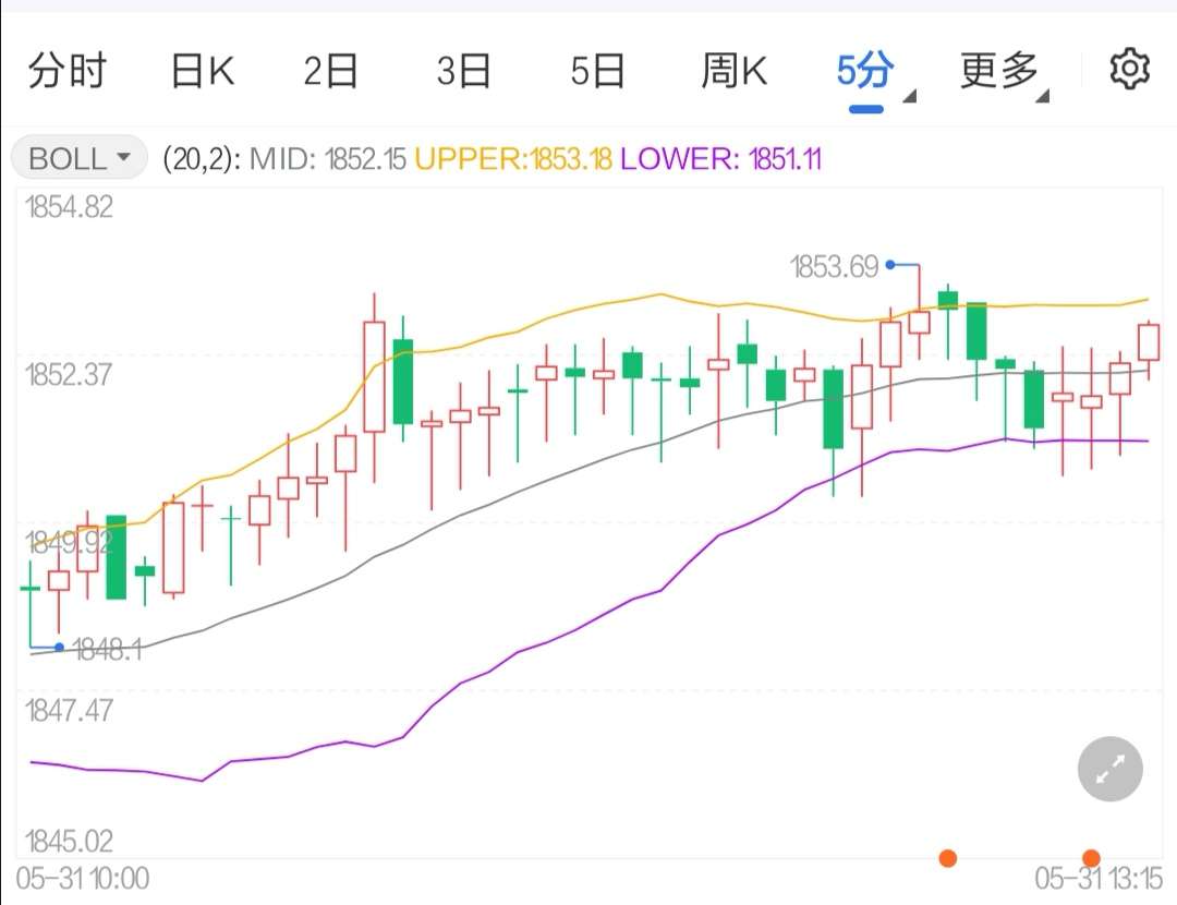 今日周二(5月31日),黄金盘内目前暂且企稳于1851美元/盎司相近,日线金价小幅下行走势,短线黄金价值波动震荡,截至目前,黄金暂报1851.72美元/盎司。