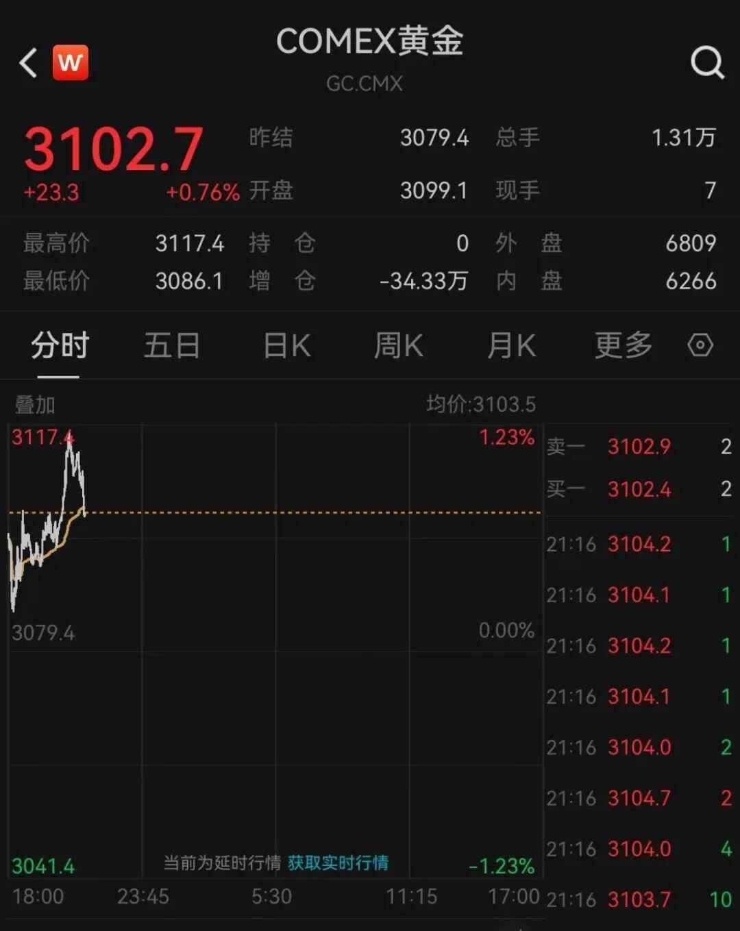 4月10日凌晨,COMEX黄金期货涨3.67%报3099.8美元/盎司,创2020年3月从此最大盘中涨幅。截至发稿报3102.7美元/盎司。