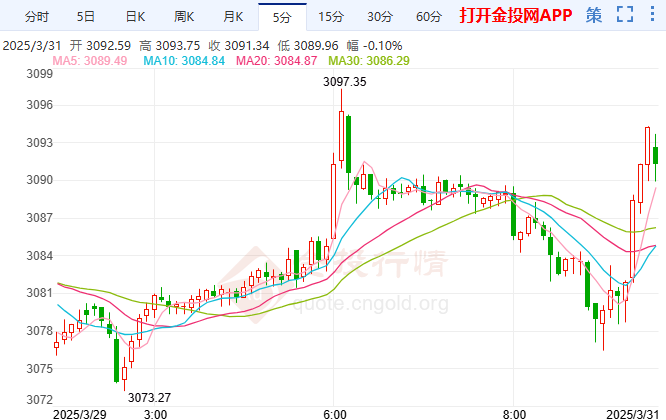 周一(3月31日)亚洲营业时段开盘后,因美邦总统特朗普的群情激发避险激情升温,现货黄金大幅攀升,最高触及3097.35美元/盎司,创下史乘新高,日内合怀美邦3月芝加哥PMI、美邦3月达拉斯联储贸易举止指数等数据,估计影响有限,而按照上周走势来看,黄金行情也有再度走强的动力,故此,即日金价还将看涨反弹为主。