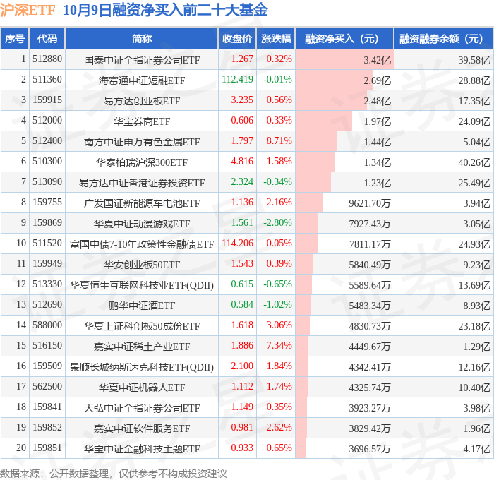 沪深ETF融资净买入前三分歧为:邦泰中证全指证券公司ETF(512880)融资净买入3.42亿元、海富通中证短融ETF(511360)融资净买入2.69亿元、易方达创业板ETF(159915)融资净买入2.48亿元,前20全体睹下外: