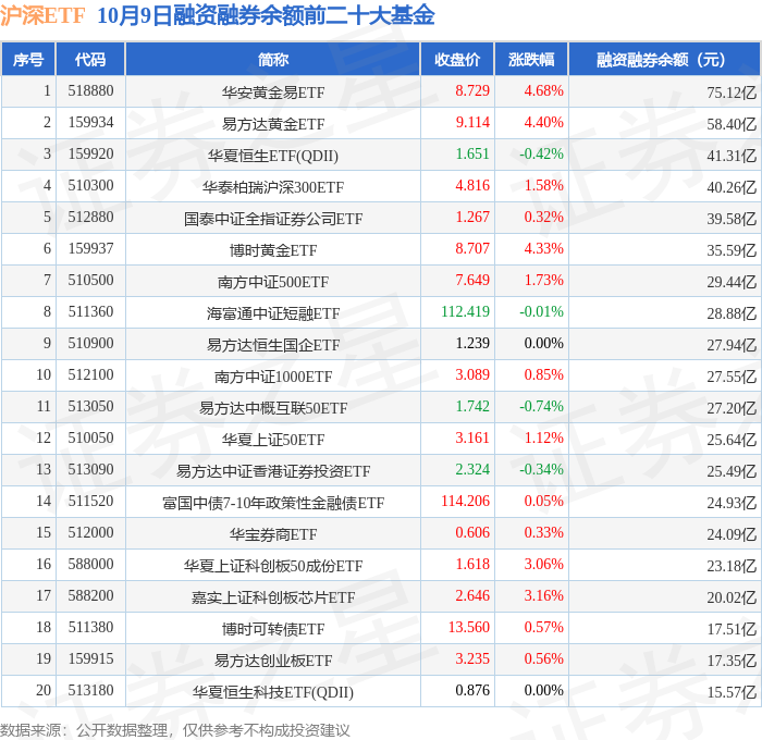 沪深ETF融资融券余额前三分歧为:华安黄金易ETF(518880)融资融券余额75.12亿元、易方达黄金ETF(159934)融资融券余额58.4亿元、中原恒生ETF(QDII)(159920)融资融券余额41.31亿元,前20全体睹下外:
