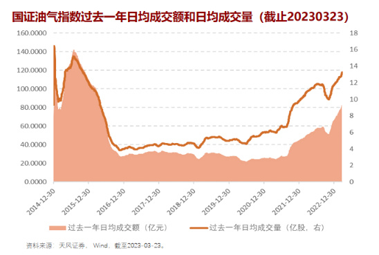 并且我创造,从2021年下半年起初,邦证油气指数过去一年日均营业额和过去一年日均成交量均有清楚擢升,截至2023年3月23日,该指数过去一年日均成交额约47.88亿元,过去一年日均成交量约7.51亿股,这个指数的交投热度清楚正在擢升。