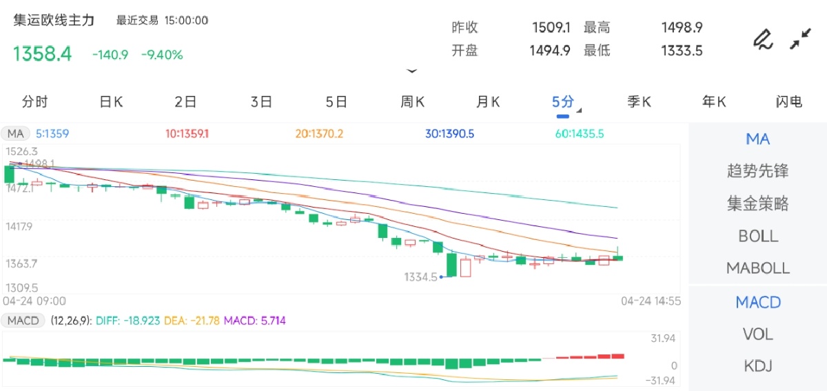 4月25日盘中,集运指数(欧线)期货主力合约境遇一波急速下挫,最低下探至1343.0元。截止发稿,集运指数(欧线%。
