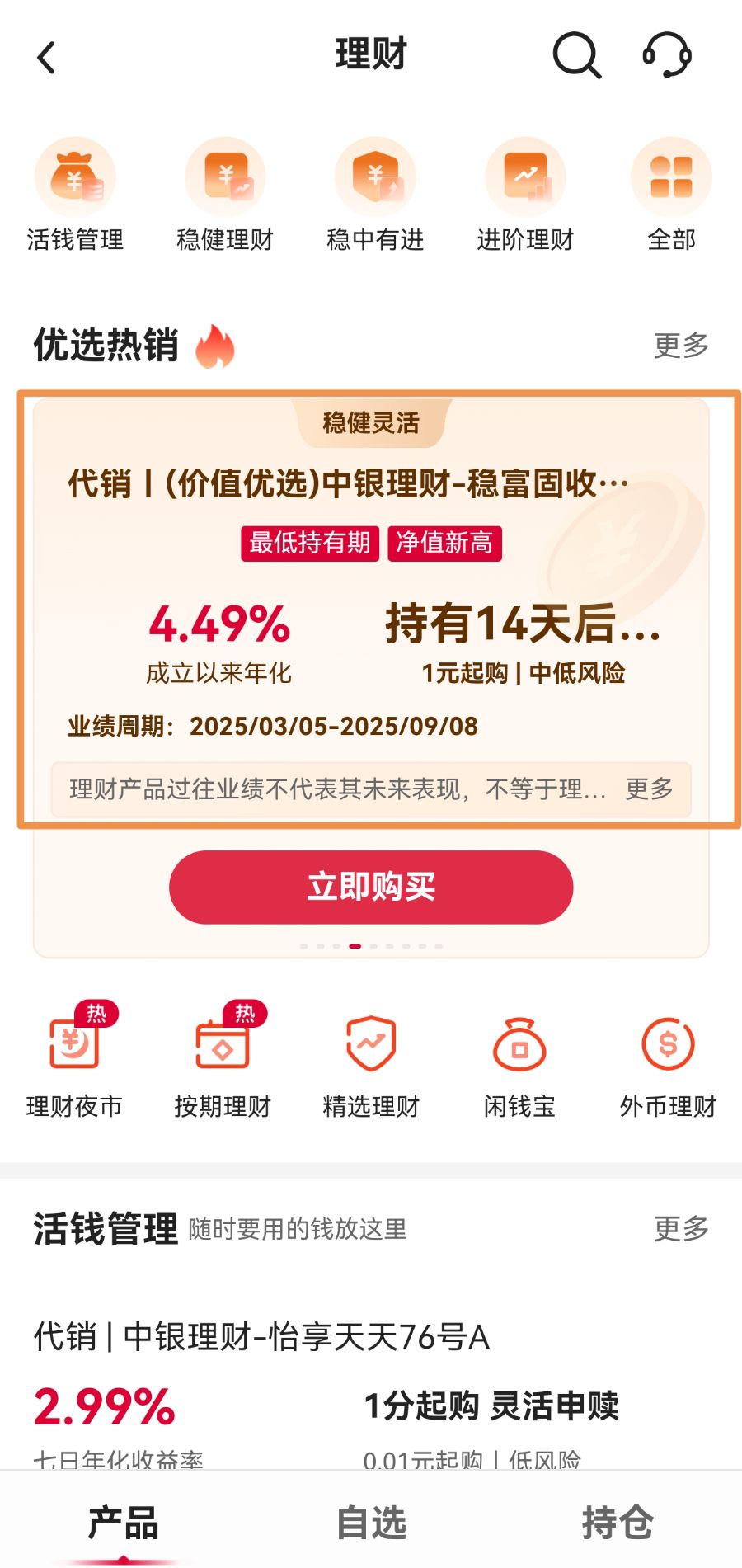 评评“理”3个月测评的中邦银行APP优选热销产物“中银理财-(7个月)最短持有期固收加强理家当物A”,9月10日最新测评分数为40分,比拟3个月前的66分显着降低。重要因为收益得分显着降低拖累,收益得分由6月11日的50分降至9月10日的20分。动作一款固收加强型产物,正在近几个月股市走强的情景下,该产物收益发扬差强者意,近1个月年化收益率仅1.15%,近3个月年化收益率仅2.49%。