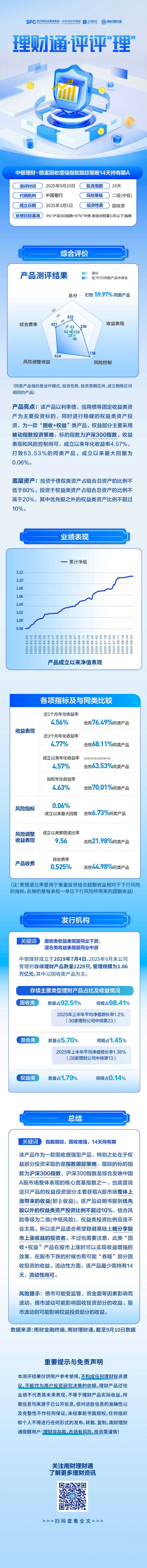 不同类型的产品得分可能不一样深交所证券指数理财通评评“理”第50期一直测评银行热销产物,本期测评中邦银行APP优选热销产物:(代价优选)中银理财-稳富固收加强指数跟踪政策14天持有期A。