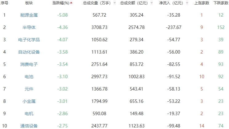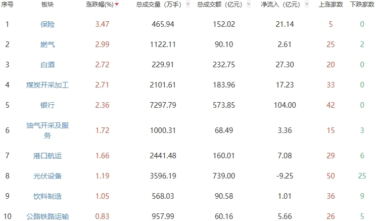 板块方面,保障、燃气、白酒等板块涨幅居前,能源金属、半导体、电子化学品等板块跌幅居前。